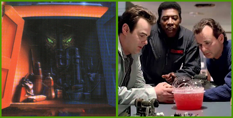 A pair of kids (our leads) in “It Came from Beneath the Sink” discover a cute little (breathing) sponge in the cabinet under the kitchen sink of the home their family just moved into. At first, the throbbing mass seems like a novel thing. However, they soon find out it feeds on misfortune and pain; the more misery that it encounters, the more it pulsates and thrives. This is identical to the glowing pink ooze which flows below the streets of New York City in Ghostbusters II. And just like how exuding love and happiness is the the only way to overcome that evil rosy goo, love and warmth is the only way to destroy the sinister sponge. But if you ask me, the book is sorely lacking in a rousing rendition of Jackie Wilson’s “Higher and Higher.”