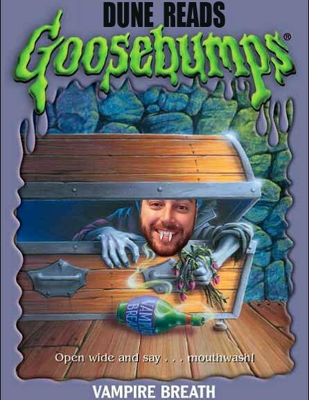 DUNE: I get that from time to time, I think I explained it in an old episode as the show being called DUNE READS Goosebumps, in the same way that you’d expect a Metallica does Sinatra to be metal, you should expect the show being my drunk ass interpreting the content. Also, it’s definitely parody with my changes and commentary, if I was just trying to read straight audio books and give them out for free that would be clearly illegal.